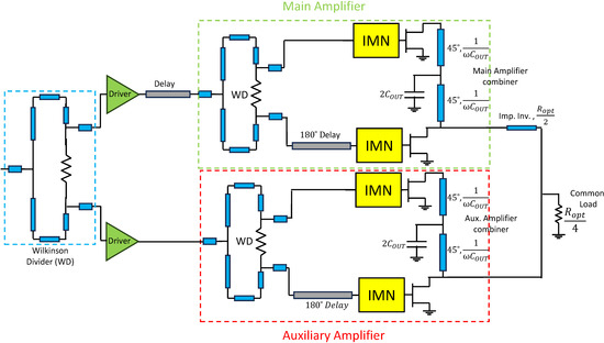 After understanding the capabilities of the proposed combiner, it can be applied to design a DPA using a straightforward structure. This structure is depicted in Figure 2. In this design, the main and peak amplifiers are formed by two devices combined by using the proposed combiner. If the optimal load for each transistor is , then the characteristic impedance of the impedance inverter is defined as , and the common load of the DPA is [11]. The selected device is a μm from GaN-on-SiC MMIC Wolfspeed G28v5 process with 0.15 μm gate length.