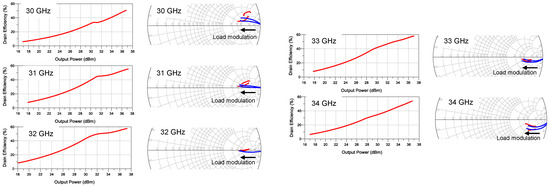 To evaluate the concept, a DPA using ideal components (transmission lines, capacitors, etc.) and drivers is simulated. Figure 3 shows the simulated drain efficiency versus output power and the load modulation effect for the main and peak devices (i.e., and ). The simulation indicates a potential bandwidth of 4 GHz for the DPA. Note that the most optimal load modulation is achieved at 32 GHz, the chosen frequency.
