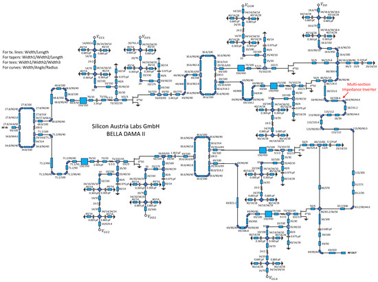 In the DPA version incorporating real transmission lines, a 100 impedance inverter was synthesized using a four-section structure. This approach was necessary because a 100-ohm impedance results in a very narrow width in the employed technology. Consequently, an adjustment was required in the delay at the input of the main amplifier cell to ensure proper phase alignment. Additionally, bias tees were designed utilizing high impedance transmission lines, characterized by narrow lines. Circuit stability was maintained with the inclusion of a series resistor at the gate of each device, complemented by an additional resistor within the bias tee structure. The driver amplifier was designed with an input matching network similar to that of the main and peak amplifiers, and an output matching network (OMN) was implemented to match the 50-ohm impedance of the dividers at the input of the main and peak cells. The preamplifier (driver) at the peak branch has been biased at class C, while the peak cell was kept in Class AB. Figure 4 shows the schematic of the obtained DPA. The nominal value of the capacitor between lines in the combiner structure changes due to the non-ideal characteristics of real capacitors, which introduce parasitic effects that alter the effective capacitance. This variation must be accounted for in the design to ensure proper combiner performance. The DPA layout is shown in Figure 5 with a chip size of 4.6 × 3.6 mm, where the applied voltages to any stage of the circuit are indicated.