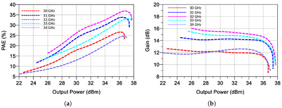 In addition, Figure 8 provides a detailed view of the gain and PAE profiles specifically at 32 GHz, which is the center frequency of the design. This figure also includes fundamental load modulation performance, demonstrating how well the amplifier handles load modulation and maintains efficiency. The detailed analysis confirms that the proposed design not only achieves high performance, but also provides effective load modulation, making it well-suited for practical high-frequency applications.