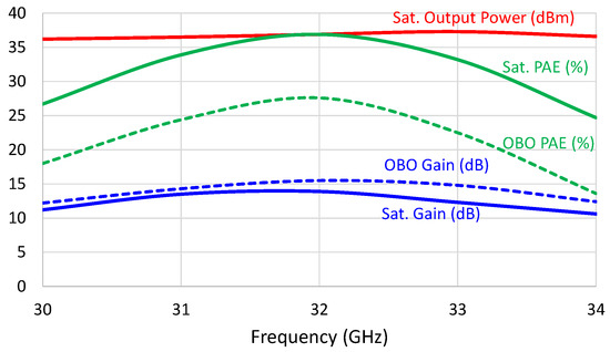 Simulation results for the 30 to 34 GHz bandwidth reveal that the amplifier achieves a Power Added Efficiency (PAE) at 6 dB Output Power Back Off (OBO) ranging between 14% and 28%, indicating a robust performance across the frequency range. At saturation, the PAE improves significantly, reaching between 24% and 37%, demonstrating the amplifier’s efficiency under peak conditions. The gain at saturation consistently exceeds 11 dB, which is crucial for maintaining signal integrity and amplification quality. The output power surpasses 36.5 dBm, equivalent to over 4.47 W, reflecting the amplifier’s capability to deliver substantial power levels for high-demand applications.