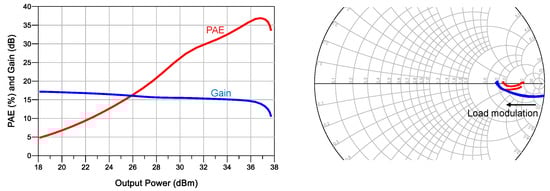 Simulated PAE and load modulation at 32 GHz for the designed DPA.