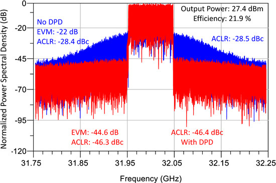 The performance of the newly designed mmW DPA was tested using the Keysight ADS 2024 DPD Explorer simulation tool. The simulation involved a 100 MHz 5G NR signal with a carrier frequency of 32 GHz, a Peak-to-Average Power Ratio (PAPR) of 9 dB, and an available power of 12 dBm. Results, as depicted in Figure 9, compare the power spectral density of the PA’s output with and without the application of Digital Predistortion (DPD). Incorporating DPD, using a Generalized Memory Polinomial (GPM) model with a memory depth of 3 and order 7, significantly improved the Adjacent Channel Leakage Ratio (ACLR), raising it from 28.5 dBc to 46.3 dBc. The Error Vector Magnitude (EVM) was improved from −22 dB to −44.6 dB. The average output power simulated was 27.4 dBm, and the PAE averaged 21.9%.