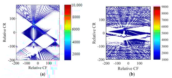 The time–frequency transforms are based on one-dimensional energy integration and have a low anti-noise performance. In the field of radar signal processing, a high anti-noise performance is usually necessary [12]. Aiming to weaken this problem, another category of algorithms dealing with noisy multicomponent LFM signals is developed, known as the CF–CR analysis technique (CFCRAT) [12]. In the past decades, many successful algorithms have been proposed. Based on the direct integration of the LFM signal, the maximum likelihood (ML) method [13], discrete Chirp–Fourier Transform [14], modified discrete Chirp–Fourier Transform [15] and fractional Fourier transform [16] are proposed. Because of the linearity, they do not have the influence of the cross term. Since the energy of each auto term of time–frequency transforms is concentrated into a line whose slope is related to the CR [17], some line integration-based algorithms are proposed. Representative algorithms include the Hough short-time Fourier transform [18], Hough-local polynomial periodogram [19], Wigner–Hough transform (WHT) [20] and modified-WVD [21]. Recently, the time-CR transforms similar to the time–frequency transforms are proposed and several integrated time-CR transforms are also developed in [22,23,24,25,26,27,28,29]. The CFCRAT is based on the two-dimensional energy integration and greatly enhances the anti-noise performance. Unfortunately, the past decades’ research indicates that, no matter how the CFCRAT works in radar signal processing, some drawbacks are inherent and cannot be overcome [12,13,17,18,19,20,21], such as the low resolution, peak-to-sidelobe level (PSL) along the CR axis, etc.