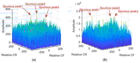 For the LVD proposed in the reference [17], the selection criterion of the constant delay aims to guarantee that, (1) no interpolation is required along the scaled time axis and both sides of the scaled time axis are symmetrical, and (2) the CR value can be directly read from the CF–CR plane. By contrast, the selection criterion discussed here considers the interpolation, cross-term suppression, resolution, PSL, anti-noise performance, signal length and direct reading of the CR value. The selection criterion discussed here is more practical. For more details about the selection, we can refer to references [12,17,37].