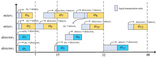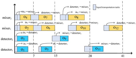 Figure 2b shows the placement with minimized transportation conflicts for binding scheme 1, which has eight intersections and reduces the reuse of flow channels. Figure 4 shows the rescheduling result of binding scheme 1 in the placement with minimized transportation conflicts. It can be seen from the Figure 3 and Figure 4 that the conflicts between the inputs of and have been eliminated, as well as the conflict between the inputs of and , which improves the efficiency of the chip but increases the total length of the channels. After the conflicts between the input tasks of and and between the input tasks of and were eliminated, the execution efficiency of the chip was improved and the total reaction time was 41 s. The placement with minimized transportation conflicts increases the length of the lines at the cost of reducing the total reaction time by 7 s compared to the minimum-line-length CFMB architecture, thus improving the efficiency of the chip.