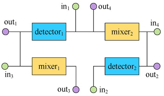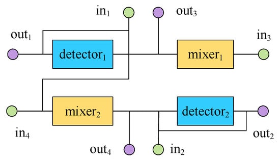 For binding scheme 2, the CFMB’s architecture shown in Figure 5 considered the impact of the relative positions of component interfaces and input/output ports on wiring during the placement. The placement in Figure 7 minimizes the sum of distances between the center points of each component (treating input/output ports as a special component) as the objective. However, due to the lack of consideration for the relative positions of component interfaces and input/output ports, the CFMB architecture shown in Figure 7 paid a higher cost for the following two flow paths compared to Figure 5: (1) ; (2) . This increased two intersections and the total length of the channels. Therefore, considering the impact of the relative positions of component interfaces and input/output ports on wiring during the placement stage is beneficial for optimizing the total length of channels, the number of intersections, and other objectives.