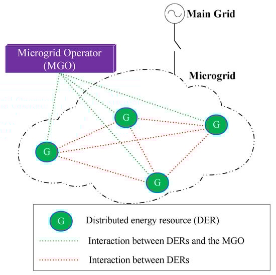 The integration of distributed energy resources (DERs) within microgrids has marked a pivotal shift in energy systems, introducing a paradigm where localized generation and consumption intertwine []. DERs, consisting of renewable energy sources, storage systems, and flexible loads, play a crucial role in enhancing the resilience and sustainability of microgrids []. These resources operate at smaller scales but interconnect within larger energy networks, poised to revolutionize energy generation and distribution dynamics. Amidst this transformative landscape, the strategic interactions between DERs and the microgrid operator (MGO) stand as a cornerstone []. These interactions delineate a complex interplay of decision-making processes, where DERs seek to maximize their individual benefits through active power generation, while the MGO endeavors to optimize the microgrid’s overall performance, notably by improving its power factor. This strategic interdependence between DERs and the MGO forms the crux of this study, offering insights into the equilibrium strategies and evolutionary pathways that emerge from their interactions.