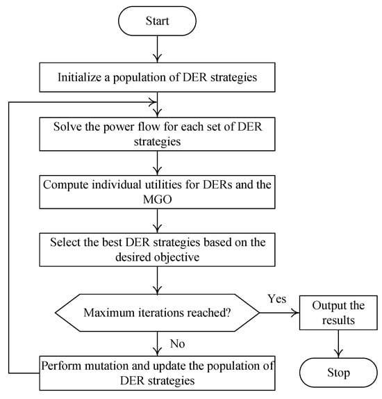 The evolutionary process represents a methodical sequence of actions aimed at refining strategies for DERs and the MGO within a microgrid setting. Figure 3 illustrates the evolutionary process adopted in this study. Initially, the process initializes strategies randomly, fostering diverse starting points for subsequent iterations. It then evaluates the utilities of DERs and the MGO based on these strategies, determining their effectiveness in achieving objectives. Strategies yielding higher utilities are selected for reproduction, akin to natural selection favoring more successful traits. Meanwhile, occasional mutations maintain diversity, preventing premature convergence []. Through multiple iterations, strategies are adapted and refined, with DERs and the MGO adjusting their approaches based on past performance. This iterative framework involves multiple stages that drive the evolution of strategies toward a more optimal configuration, as outlined below.