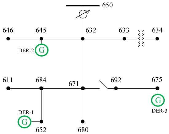 The 4.16 kV-rated IEEE 13-node distribution test system serves as a compact feeder with a notable load capacity and encompasses various integral components. This system configuration includes a substation featuring a star-connected voltage regulator comprising three 1-phase units. Noteworthy elements within this system include shunt capacitor banks, an in-line transformer, and a mix of spot and distributed loads, potentially exhibiting imbalances. According to the data sourced from [], the total active load and reactive load for this system are 3577 kW and 1725 kVAr, respectively. Furthermore, Figure 4 portrays the integration of three DERs into this system, each assumed to have total available capacities of 500 kW (DER-1), 600 kW (DER-2), and 700 kW (DER-3), respectively.