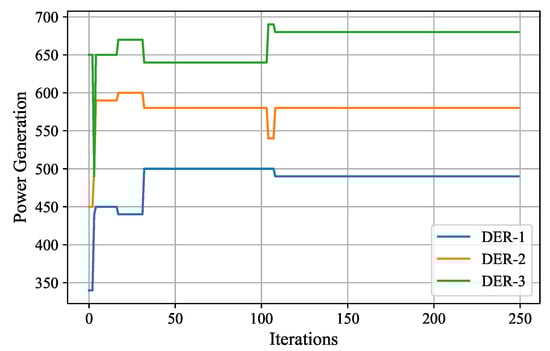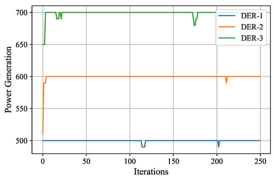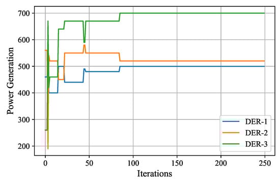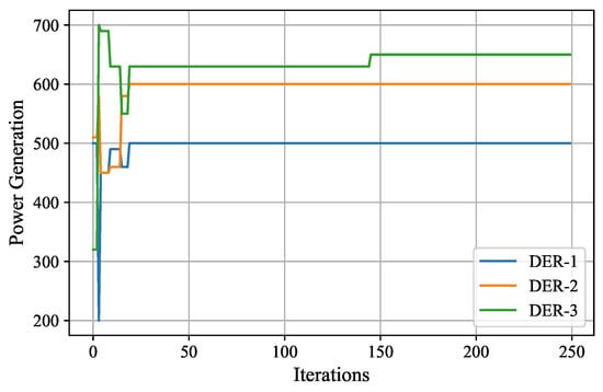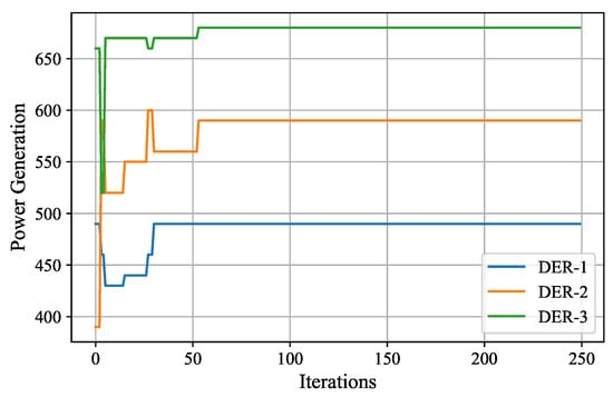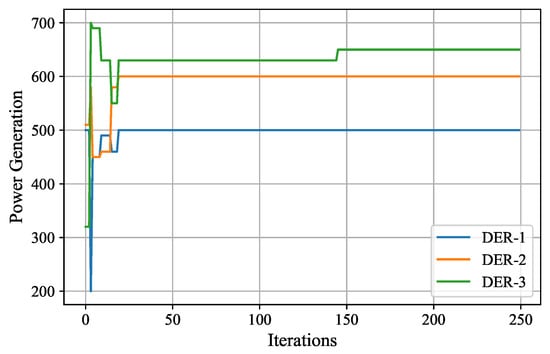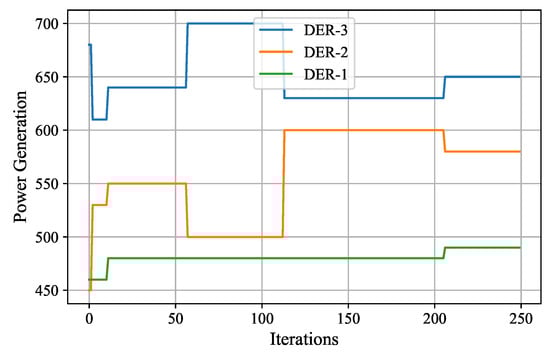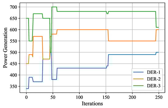 In this scenario, all DERs collaborate among themselves to optimize the individual utility of the MGO. This particular situation of DERs cooperating to enhance the MGO’s utility is feasible when the DERs are owned by the MGO, aiming to bolster the overall system performance. Figure 9 depicts the evolution of the most optimal DER strategies across iterations for this case, showcasing the strategies adopted by the DERs to maximize the individual utility of the MGO in each iteration.