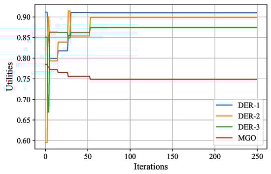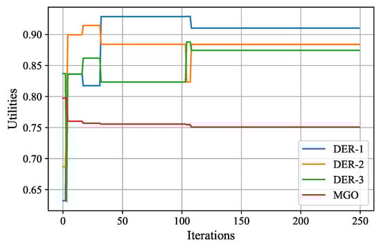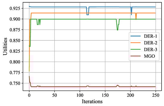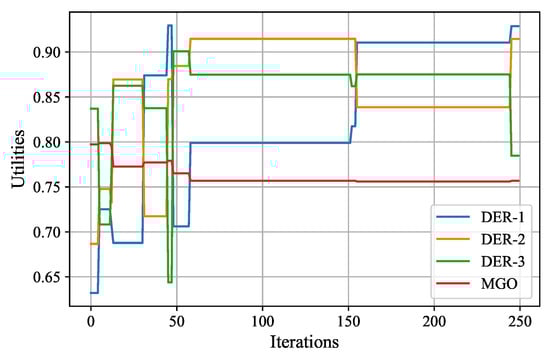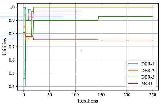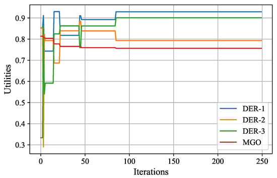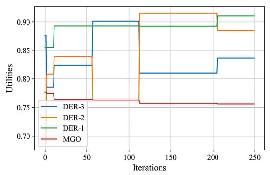 Initially, from the pool of randomly generated DER strategies, the most optimal strategies identified for DER-1, DER-2, and DER-3 were 500 kW, 510 kW, and 320 kW, respectively, in the first iteration. Similarly, Figure 8 demonstrates the evolution of individual utilities for both DERs and the MGO with the employment of these optimal strategies in each iteration. In the initial iteration, the individual utilities for the DERs were 0.9283, 0.7768, and 0.4112, while the MGO exhibited an individual utility of 0.8092.