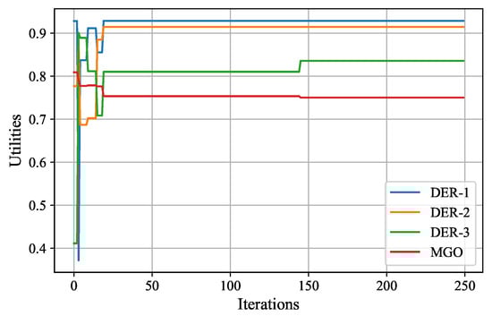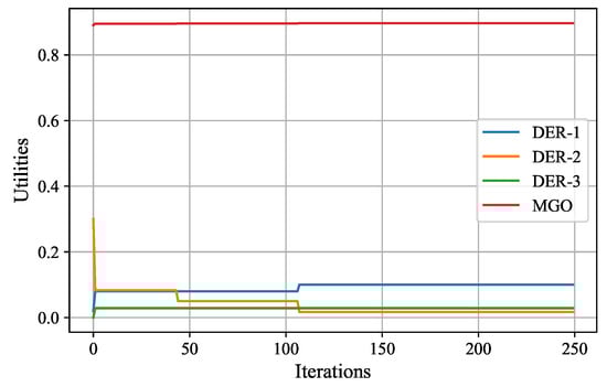 Similarly, Figure 19 demonstrates the evolution of individual utilities for both DERs and the MGO employing these optimal strategies in each iteration. Table 3 displays the stable strategies and corresponding individual utilities of DERs and the MGO for this case. The collective utility of DERs in this case is 2.6233, lower than that of Case 2, which is 2.6788.