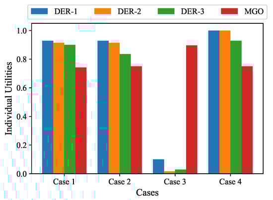 In Case 4, where all DERs and the MGO collaboratively aim to maximize their collective utility, the individual utilities of DERs display significant improvement. As DERs work towards collective utility maximization, the MGO refrains from penalizing these DERs, even as part of a coalition. However, it appears that the MGO’s individual utility remains unchanged compared to Case 2, where DERs collaborated without involving the MGO.