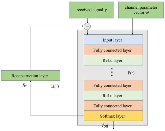 in which and represent the weight matrix and bias vector of the k-th fully connected layer. signifies the estimated value of the one-hot code output by the detection module. This estimated value can be transformed into the estimated modulation symbols by