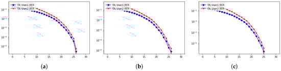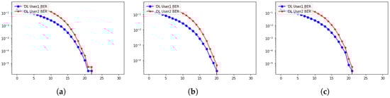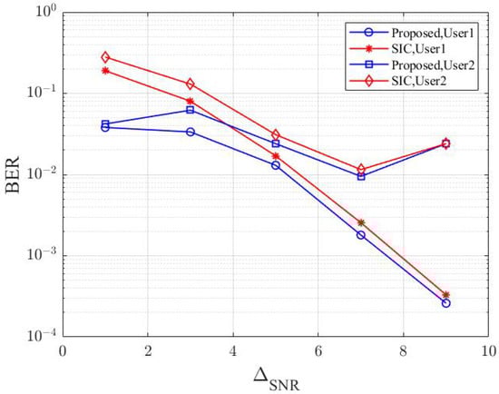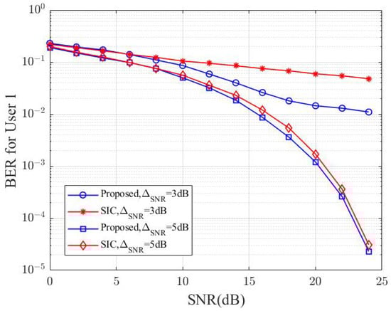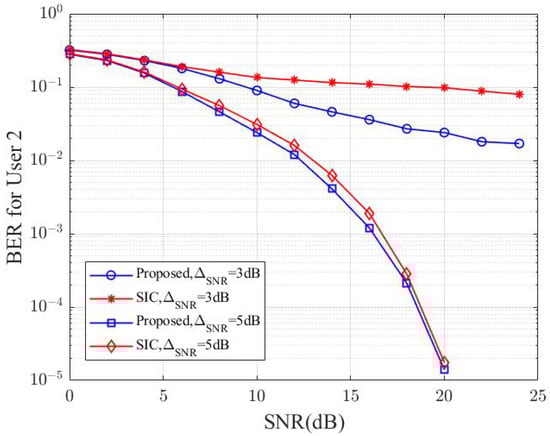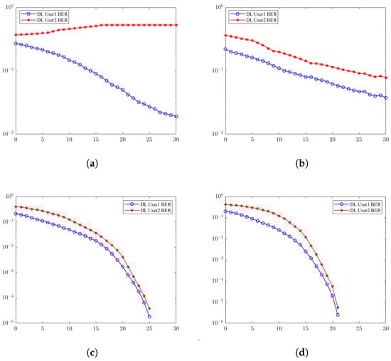 When , user 2 struggles to reduce BER due to the small , making it challenging for receivers to separate signals. So, the BER curve of user 2 is close to a parallel horizontal line without a downward trend. As the increases, BER descent accelerates, indicating improved signal distinguishability. When , BER curves show a linear decline from to . Further increases in and lead to even faster BER reduction, reaching for and for at . This demonstrates that a higher correlates with a lower BER.