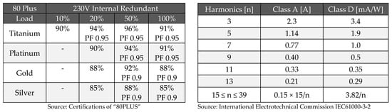 Examples of the PF and THD regulations utilized in computer power supplies are shown in Figure 1. The 80 PLUS certification serves as a benchmark for high-quality power supplies and offers four levels based on efficiency and PF. The highest level, titanium, demands an exceptionally high PF under 20–100% load conditions. Recently, this regulation has become more stringent, often requiring a very high PF even at a 20% load condition. In addition, IEC 61000-3-2 imposes limits on harmonic currents, effectively regulating the THD.