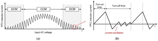 Among the various PFC converters, the boost PFC converter is widely utilized with continuous conduction mode (CCM) control owing to its high efficiency with a minimal number of components. In addition, it has a high PF and low THD compared with other PFC converters. However, although the boost converter is designed to operate with the CCM, when the output load is reduced in light-load conditions, the average inductor current is decreased and the inductor current starts to reach to 0 A. As a result, the CCM boost converter starts to operate with the DCM boost converter in light-load conditions. In particular, since the inductor current is small near the low input AC voltage, the DCM region occurs near 0 V of the input voltage. At that time, the inductor current still operates as the CCM near the peak of the input voltage. Therefore, the CCM and DCM regions both exist in the light-load condition. This is called mixed conduction mode (MCM), as shown in Figure 2a [5,6,7,8,9]. The problem with the MCM is that the DCM region makes current oscillations, as shown in Figure 2b, which degrades the PFC and THD [10,11,12,13,14,15,16,17].