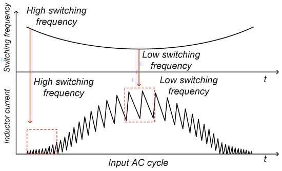 where is the input current, is the current ripple of the inductor, Vline is the line voltage, Dswitch is the duty ratio of the switch, Lboost is the boost inductor, and fswitching is the switching frequency. Therefore, the DCM region decreases by increasing the switching frequency, resulting in improved THD and PF. However, although a high frequency improves the PF and THD, the frequency cannot be easily increased by the general power supply because it causes high switching losses at the switches. Thus, the proposed method adopts frequency modulation, as shown in Figure 3.