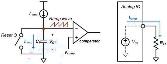The switching frequency of the general analog IC is determined by the frequency of the ramp wave. The ramp wave represents the voltage of the timing capacitor CT, which increases when the ramp current Iramp flows through the timing capacitor, as shown in Figure 4. The ramp current is decided by the internal reference voltage and external resistor. Once the ramp voltage reaches a particular level, it is reset by utilizing a switch. Therefore, the frequency of the ramp wave varies with variations in the ramp current. In a general IC, as shown in the figure, the ramp current can be externally modulated with a reference voltage and RT to set the switching frequency. Therefore, to implement the proposed method, a line voltage adaptive lamp current is required.