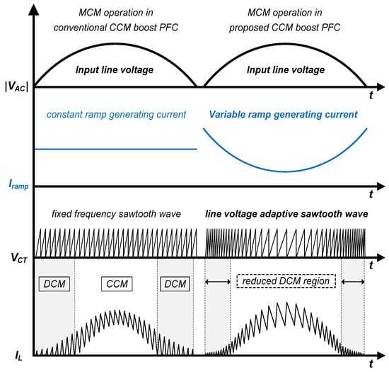 The major waveforms of the conventional boost PFC converter and proposed converter during MCM operation are shown in Figure 6. In the conventional converter, the switching frequency remains constant regardless of input voltage variations, resulting in a large DCM region. However, with the proposed frequency modulation scheme, the switching frequency varies with the line voltage. Because the switching frequency is higher near the zero-crossing area, the proposed converter has a reduced DCM region, which results in high PF and low THD. The full system with the Section 3.1 is attached in Appendix A.