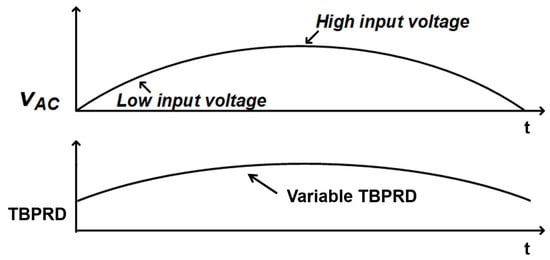 where TBPRDAC is an additional TBPRD value to vary the TBPRD during the line cycle, is a modulation factor from the ADC voltage to the TBPRD. The shape of the TBPRDAC is similar to that of the input line voltage, and its value is determined by utilizing . For a slight variation in the switching frequency, can be designed with a small value. In this case, the change in the conventional TBPRD value was insignificant with the addition of the TBPRDAC. Thus, can be designed with a large value, provided the frequency can vary considerably.