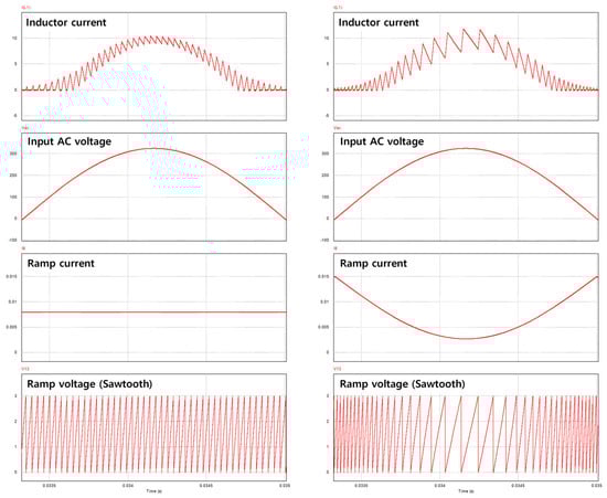 The key waveforms of the proposed frequency modulation scheme are shown in Figure 8. In the conventional boost PFC converter, which is the left figure, the ramp current is constant, and the frequency of the ramp voltage is also constant. On the other hand, the proposed boost PFC converter, shown in the right figure, has variable ramp current by using the input voltage to make the ramp current. As a result, the proposed converter has a lower frequency near the high input voltage and a higher frequency near the zero voltage. Since the switching frequency cannot be observed during the 60 Hz input frequency, the input voltage is adjusted to a relatively high frequency to see the switching frequency.