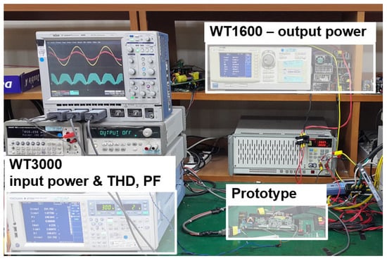 The testbed for the prototype converters is shown in Figure 9. To ensure precise measurement of the PF and THD, a Yokogawa WT3000 power analyzer [24] was utilized. This power analyzer boasts an exceptional accuracy of 0.02%. In addition, it offers a bandwidth range from 0.1 Hz to 1 MHz for PF and THD measurements. The output power was measured by utilizing a Yokogawa WT1600 power analyzer [25].