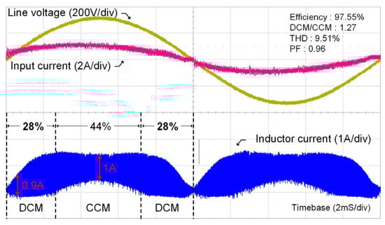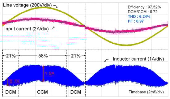 Compared with the conventional system, the proposed converter in Figure 11 shows a considerably lower DCM region under the same output load condition. Because the switching frequency is increased near zero voltage, ripple currents are reduced compared with the conventional boost converter, and the DCM region decreases from 56% to 42%, representing a 25% reduction. On the other hand, the ripple current near the peak voltage increases from 1 A to 1.5 A due to low switching frequency. Therefore, the proposed converter achieved high-quality current through the implementation of a novel frequency modulation scheme.