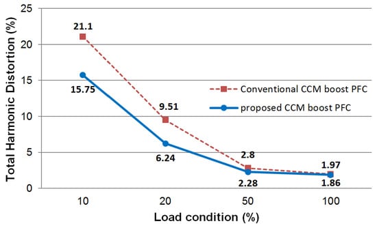 The measured THD values of both converters under all load conditions are shown in Figure 12. Notably, the proposed converter showed no improvements at heavy loads, as the THD remained consistently low. However, as the output load decreased, the DCM region increased, resulting in a significant increase in the THD. In practice, because the THD is generally low under heavy-load conditions, the key to satisfying various regulations is to have a low THD under light-load conditions. The advantages of the proposed converter are significant under light-load conditions.