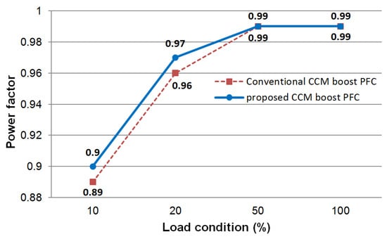 The measured PF values of the prototypes are shown in Figure 13. In general, the value of the PF is high under heavy-load conditions, similar to the THD. However, as the output load decreases, the PF starts decreasing as well. The main reason for the decrease in the light-load condition is related to the phase-leading current in the input capacitor. This current, with a different phase from the input voltage, predominantly degrades the PF. Notably, the absolute value of the phase-leading current remained constant regardless of the output load condition; thus, it significantly influenced the PF under light-load conditions. Therefore, the proposed scheme does not yield a considerable improvement in the PF, as the low PF under light-load conditions is not related to the DCM region. However, the PF consists of a displacement and distortion factor. Therefore, improving the THD has a positive effect on achieving a high PF. As a result, the PF of the proposed converter was slightly improved under light-load conditions.