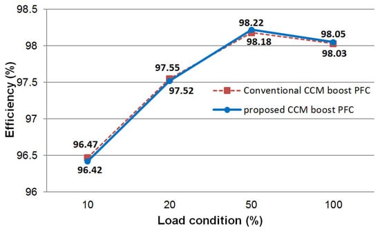The measured efficiencies of both prototype converters are shown in Figure 14. Although the proposed converter operated at a high switching frequency to reduce the DCM region, it did not degrade the efficiency under all load conditions. This is because the proposed converter reduced the switching frequency near the peak of the input line voltage. Therefore, the proposed converter improved the PF and THD without degrading efficiency.