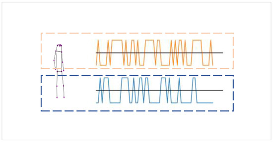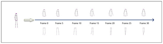 CASIA-B [44] is one of the most commonly used datasets in the field of gait recognition. It consists of 124 participants, and it recorded each individual’s walking gait in 10 different conditions (6 NM conditions—walking normally, 2 BG conditions—walking with a backpack, and 2 CL conditions—walking with thick clothing). Each gait condition was shot from 11 different viewpoints (from 0 to 180 degrees, with 18-degree intervals). To evaluate our network, we used the same protocol as [16]. The first 74 participants were trained as the training set and the remaining 50 participants were tested as the test set. The test set used the first four gaits in the normal walking condition as the gallery set and the rest of the gaits in the other conditions as the probe set. We extracted skeletal data from CASIA-B using a pre-trained HRNet [47] pose estimator.