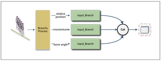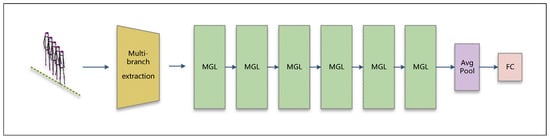 The framework of our multi-branch extraction module is shown in Figure 4. The multi-branch extraction module includes multi-branch processing and three input branch extraction modules. Among them, the multi-branch processing converts the input gait skeleton sequence computation into joint point relative position information streams, joint momentum streams, and bone angle streams. Each information stream is passed to a different input branch extraction module to extract feature information, and the final extracted feature information is channel spliced. It is worth mentioning that the input branch extraction module is a combination of three MGL modules. The whole multi-branch extraction module can be represented as follows: