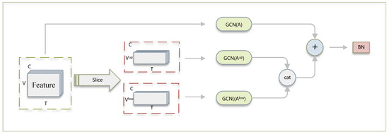 The overall process of GLGCN. C, T, and V represent the channel, time dimension, and joint point dimension, respectively. and are the upper and lower limb joint points obtained by slicing the features along V. A, , and , respectively, represent the prior matrices, the prior matrix for the upper limb joints, and the prior matrix for the lower limb joints, respectively. BN denotes batch normalization.