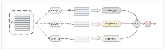 The overall process of MTCN. , , and represent the output channel, intermediate channel and remaining channel of MTCN, respectively. Conv(1, 1) denotes a 1 × 1 convolution, Maxpool(x, 1) denotes maximum pooling with a pooling kernel of (x, 1), Avgpool(x, 1) denotes the average pooling with a pooling kernel of (x, 1), FC denotes fully connected layer.