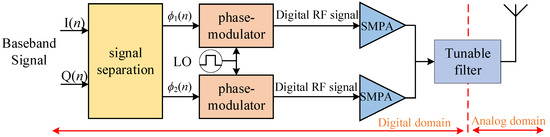In recent years, the development trend of wireless communication has been to utilize software radio to achieve functions of the digital domain for a transmitter. The all-digital transmitter (ADTx) has developed rapidly, and its flexible reconfigurable and programmable performance meets the design requirements of the high efficiency of the transmitter and the demand of SDR technology [1,2]. ADTx implements radio frequency (RF) functions such as up-conversion and pulse encoding in the digital domain and is mainly composed of a direct digital radio frequency modulator (DDRFM), a switched-mode power amplifier (SMPA), and the tuning filter. The DDRFM not only realizes the digital up-conversion of the baseband signal but also converts the digital radio frequency signal into a pulse signal suitable for switching amplification through a certain pulse encoding algorithm [3].
