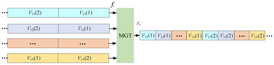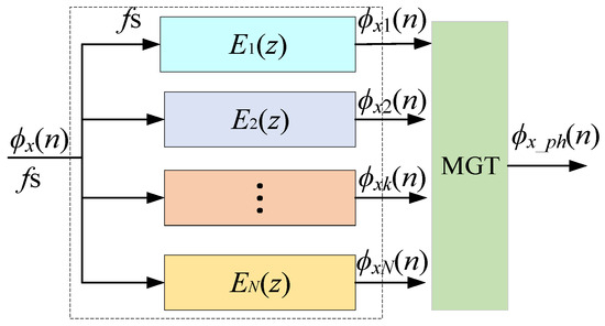 where M = L/N should be an integer. Formula (4) is called the polyphase decomposition of H(z). Polyphase decomposition is used to divide the prototype filter into multiple low-order sub-filters, and the order of each sub-filter is only 1/N of the original. All branches of a polyphase filter are all-pass filters with a phase difference of 1/N between the neighboring branch filters. Polyphase filtering divides the transfer function of the digital filter into several branches of different phases according to the phase equalization relationship. Thus, the structure of the polyphase interpolation filter is shown in Figure 4. The input is the outphasing signal ϕxk(n) (x = 1, 2 and k = 1, 2, …, N). The polyphase interpolation filtering part has N paths. The parallel output phase signals on adjacent paths are time continuous. If other subsequent processing is not considered, the equivalent high-speed outphasing signal ϕx_ph(n) can be obtained by directly converting the parallel outphasing signal through the MGT.