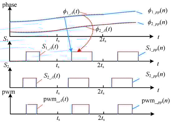 A comparison diagram of the modulation of the analog outphasing signal ϕx_A(t) and the equivalent outphasing signal ϕx_ph(n) is shown in Figure 5. According to the phase comparison, the curves of ϕx_ph(n) and ϕx_A(t) are very close, and the corresponding modulated square waves Sx_A(t) and Sx_pp(n) are close to overlap. Therefore, the error between the final synthesized pulse width modulation sequences pwm_A(t) and pwm_pp(n) is extremely small. Compared with the sample-and-hold method, the generated phase error is greatly reduced, and the quality of the output encoded signal is significantly improved in this polyphase interpolation filtering method.