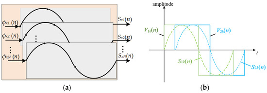 where k is the k-th path of the polyphase interpolation filter output, and n is the number of discrete time points. The output diagram of the parallel phase modulation signal Sxk(n)(x = 1,2) is shown in Figure 6a, and the input is outphasing signal ϕxk (n) (x = 1,2). The phase difference in the adjacent branch is 1/N, and the sampling rate of each branch is 1/N of Fs. In order to obtain the low words width coded signal, it is necessary to perform RF-PWM on parallel modulated signals. For the k-th path, RF-PWM needs to be performed on the above corresponding modulation signal. As shown in Figure 6b, according to the zero-crossing comparison process, the two-level square wave sequences V1k(n) and V2k(n) with different phases are generated according to the positive and negative signs of the modulation signals S1k(n) and S2k(n). Therefore, it can be considered to directly generate a two-level pulse sequence by judging the quadrant of the cosine function angle in Formula (6). Then, pulse encoding and up-conversion is achieved.