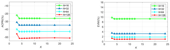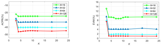 In order to explore the performance impact of the sub-filter order K on the architecture proposed in this paper, the simulation uses a 16QAM modulated signal with a baseband sampling rate fb of 50 MHz and a bandwidth of 20 MHz, and the carrier frequency fc is 200 MHz. Polyphase FIR filter coefficients are generated by Blackman window. Figure 8 shows the changing trend of ACPR and EVM values as the sub-filter order K changes when N is set to 16, 32, 64, and 128, respectively. As shown in the figure, the change in K has a significant influence on ACPR and EVM. When the sub-filter order K increases, ACPR and EVM have a gradually decreasing trend and gradually level off after K = 4. When N takes different values, the performance curve always maintains this pattern. When K is less than four, the poor performance index is due to the fact that the filter order is too low, resulting in the filtering processing not being able to achieve the ideal effect. Figure 9 shows the impact of sub-filter order changes on performance when the signal bandwidth is 5 MHz. It can be seen that the output performance curve converges faster when the bandwidth is lower. The change trends in Figure 8 and Figure 9 are similar, so when the bandwidth is small, the impact of changes in K on performance indicators can maintain the same trend as when the bandwidth is large. During the implementation process, the increase in the sub-filtering order will lead to an increase in the consumption of computing resources. Therefore, in order to balance the system performance and the consumption of computing resources, K is selected as four as the optimal value.
