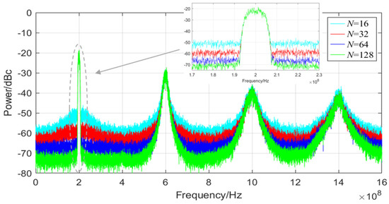 The spectrum diagram when N is taken as 16, 32, 64, and 128, respectively.