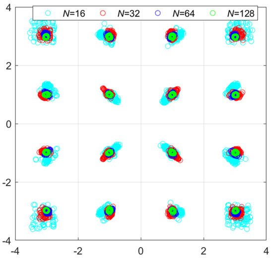 Constellation diagram distribution when N is set to 16, 32, 64, and 128, respectively (EVM are 9.1%, 4.0%, 1.7%, and 0.9%).