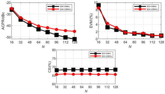 Figure 12 shows the changing trend of the output performance index when N takes different values. It can be seen that the output performance indicators have similar changing trends when the signal bandwidth is 5 MHz and 20 MHz. The increase in the number of parallel paths N has a significant impact on the optimization of ACPR and EVM. However, after the number N exceeds a certain value, the decline becomes slow. CE is less affected by N, and it remains basically unchanged with the increase in N. For input signals with different bandwidths, the narrower the bandwidth, the better the obtained ACPR and CE performance is. However, the change in bandwidth has a smaller improvement in EVM.