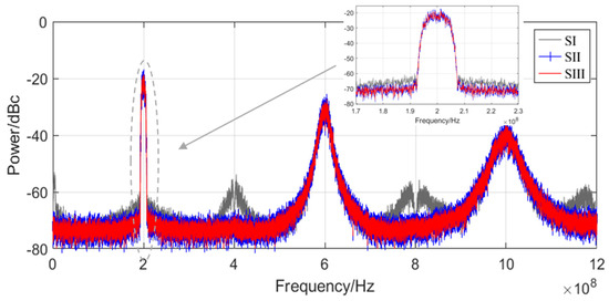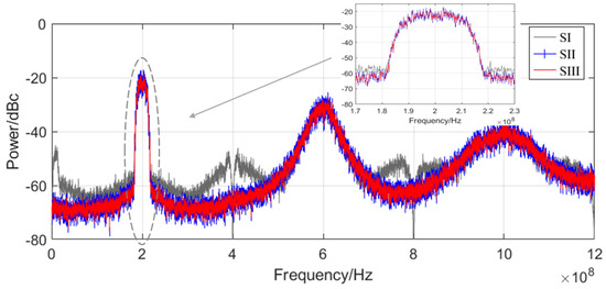 The simulation spectrum diagrams of schemes SI, SII, and SIII with 20 MHz bandwidth is shown in Figure 13. SI is the architecture proposed in [18], SII is the architecture proposed in this paper, and SIII uses a high sampling rate to achieve single path outphasing architecture. The baseband conditions selected for simulation are equal to the above, and the value of N is 128. The sampling rate of the parallel branch of schemes SI and SII is 200 MHz, and the final sampling rate of the parallel-to-serial conversion output is 25.6 GHz. The final sampling rate of SIII is the same with both. From Figure 12, it can be concluded that the simulated spectra of SII and SIII are basically consistent. Nevertheless, since the signal is processed in a single path in scheme SIII, high-speed digital signal processing is difficult to achieve. Therefore, the advantage of using the proposed architecture is to convert high-rate single-channel digital signal processing into multiple low-rate paths for parallel processing. The filtering operation is also performed on the decomposed low-order sub-filters, which greatly reduces the digital signal processing difficulty. As shown in Figure 12, compared with scheme SI, scheme SII has a better improvement in ACPR value. In addition, since scheme SI adopts the principle based on sample-and-hold, its quantization error is larger than scheme SII at the same resolution. Otherwise, even-order harmonics appear, which has a greater impact on signal quality. The ACPR for SII and SIII stands at −46.5 dBc, while for SI it is −41.3 dBc in this situation. Figure 14. presents simulated spectral graphs for schemes SI, SII, and SIII when the baseband bandwidth is set to 40 MHz. It can clearly be observed from the graph that if other conditions remain unchanged, an increase in width will lead to a decrease in ACPR. The ACPR obtained from the SII is −39.4 dBc. In order to achieve the same performance as when the bandwidth is 20 MHz, it is necessary to enhance the rate of parallel processing or to increase the number of parallel paths. This means that a higher rate of parallel-to-serial conversion is required.