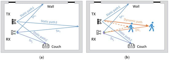 If there are no active targets in the environment, the signal received by RX is relatively stable, as shown in Figure 3a. The LoRa signal is primarily obtained through the reflection of static objects (such as walls and sofas) in the sensing area, thus forming a static vector combination. When the objects are active in the sensing area, the signal received by RX consists of the static vector of static objects and the dynamic vector of the target’s active reflection. As shown in Figure 3b, the Lora signal is not only reflected by static objects in the sensing area, but the activity of the target also affects the reflection of the Lora signal, thus leading to different changes in the dynamic vector. Therefore, when there is human activity, the propagation path of the LoRa signal in the entire sensing space can be divided into two categories: those unaffected by human activity () and those affected by human activity (). The signal received at the receiving end in the presence of human activity can be represented as follows: