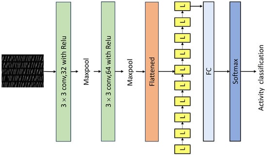 The CNN-LSTM model, as depicted in Figure 5, combines convolutional neural networks (CNNs) and long short-term memory networks (LSTMs), and it is a potent approach for image classification [38]. It inherits CNNs’ ability to extract spatial features hierarchically, thus making it adept at recognizing patterns and objects. LSTMs complement this by capturing temporal dependencies, which are crucial when dealing with image sequences or video data. The model effectively fuses spatial and sequential information, thus adapting to varying sequence lengths and providing contextual reasoning. LSTM regularization helps mitigate overfitting, and attention mechanisms allow for fine-grained analysis. End-to-end training simplifies the process, thus making the CNN-LSTM model valuable for image classification, particularly in tasks involving dynamic content or temporal contexts. By leveraging both spatial and temporal information, CNN-LSTM effectively captures complex relationships within LoRa signals, thus making it suitable for activity recognition.