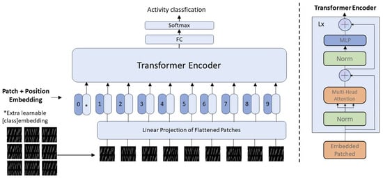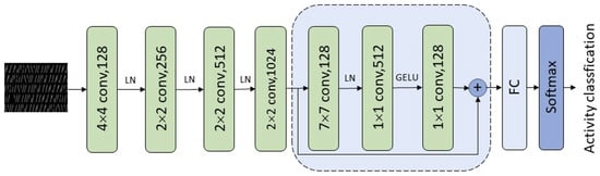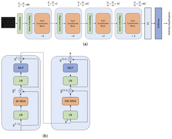 The Swin transformer is a deep learning architecture that combines the principles of transformers and convolutional neural networks (CNNs) to address various computer vision tasks, such as image classification, object detection, and segmentation [39]. Figure 6 illustrates the architecture of the Swin transformer model. The Swin transformer has achieved competitive results on various benchmarks and is considered a state-of-the-art architecture for a variety of computer vision tasks. Its hybrid design, which combines elements of transformers and CNNs, allows it to capture long-range dependencies in images effectively, thus making it a promising tool in the field of computer vision. It provides a robust framework for capturing long-range dependencies, which are crucial for understanding the temporal dynamics of activities in LoRa signals. Its modular structure with hierarchical processing enables effective feature extraction and representation learning, thus making it suitable for activity recognition tasks.
