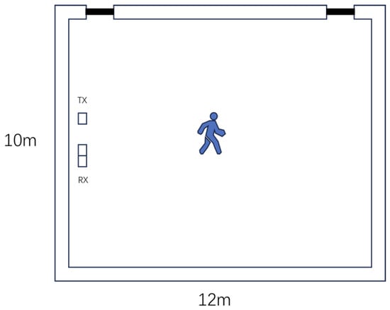 By comparing the signals received by the two groups of receivers, it is evident that, regardless of whether there is human activity, there will always be a portion of static components and in all propagation paths. This is a significant error term for the dynamic component , which is relatively smaller in coverage due to human activity. Although the changes between each group of data were not identical, they theoretically reflect similar characteristics. When finely divided into the absence of activity, the change characteristics of the data on each propagation path were also similar. Therefore, the data collected multiple times in the absence of activity should be interchangeable to some extent, and the static components and that they contain are also interchangeable. At this point, we can obtain, via DSP, the data of human activity from the two sets of data with and without human activity as follows: