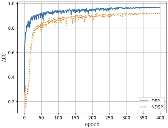 As demonstrated in Figure 12, the comparison between the ACC values for human activity recognition in the DSP and NDSP scenarios further reinforced the superiority of DSP over NDSP. The results unequivocally revealed that employing DSP technology yielded a considerably higher accuracy in the dataset validation process compared to NDSP.